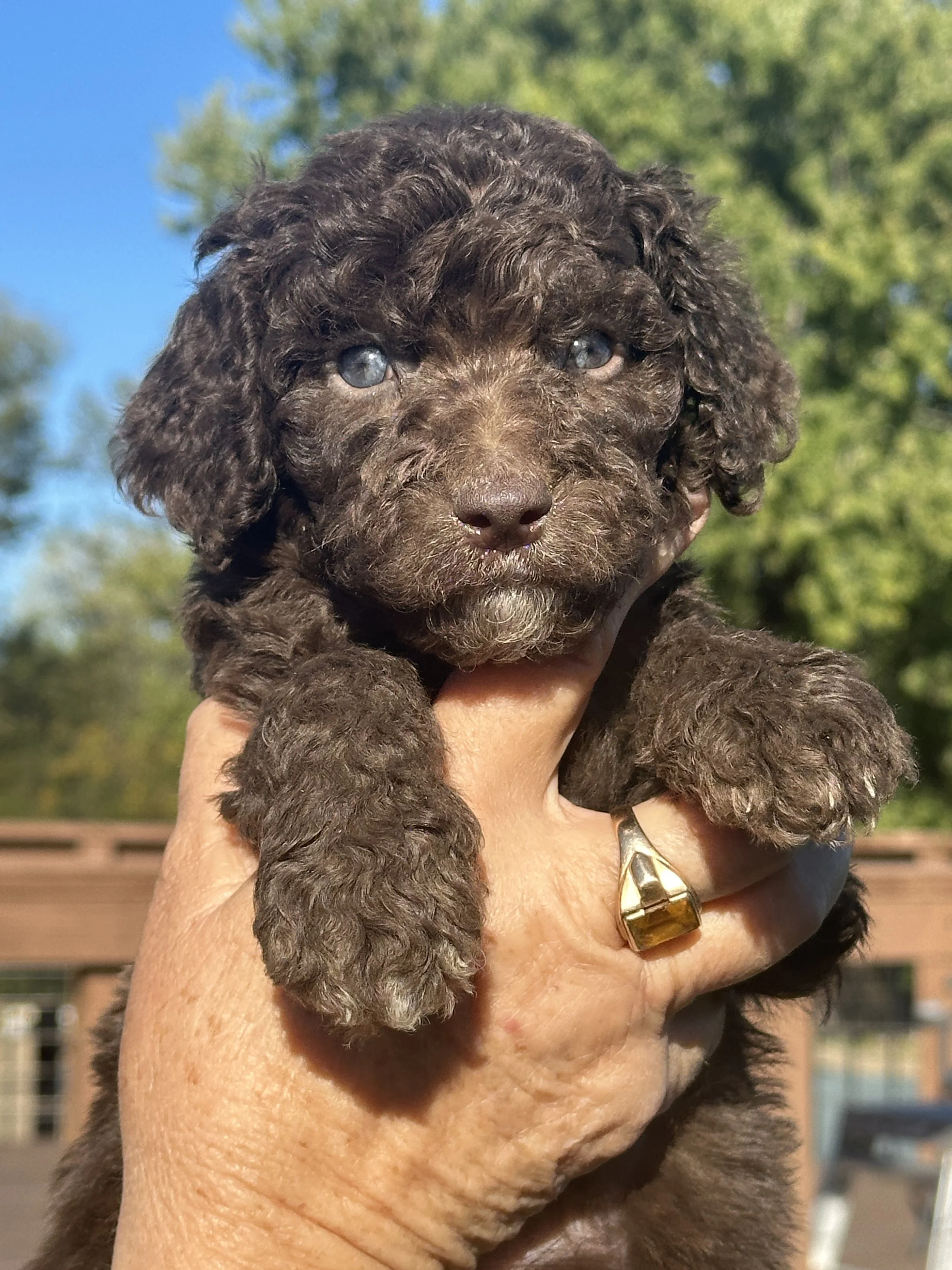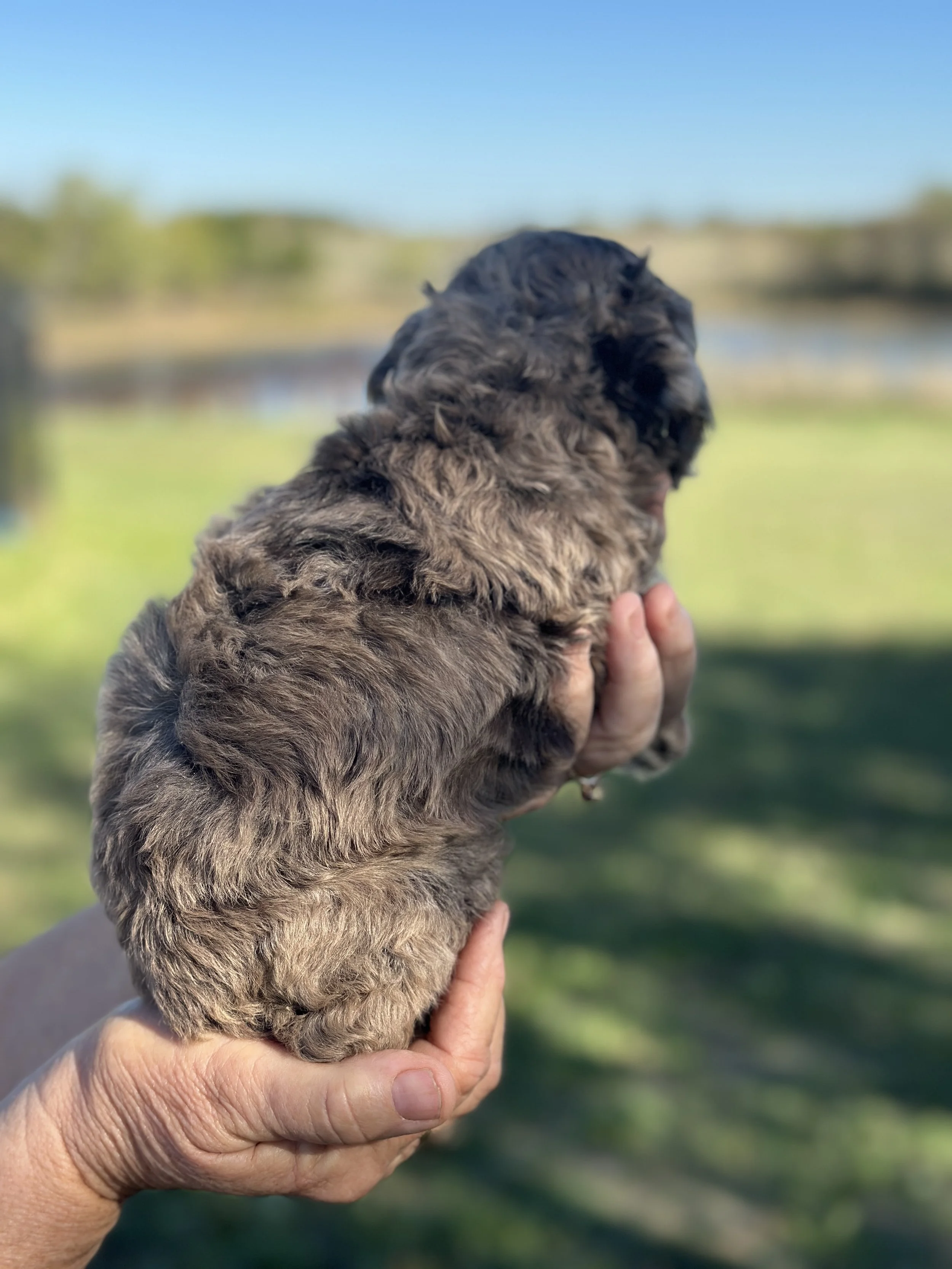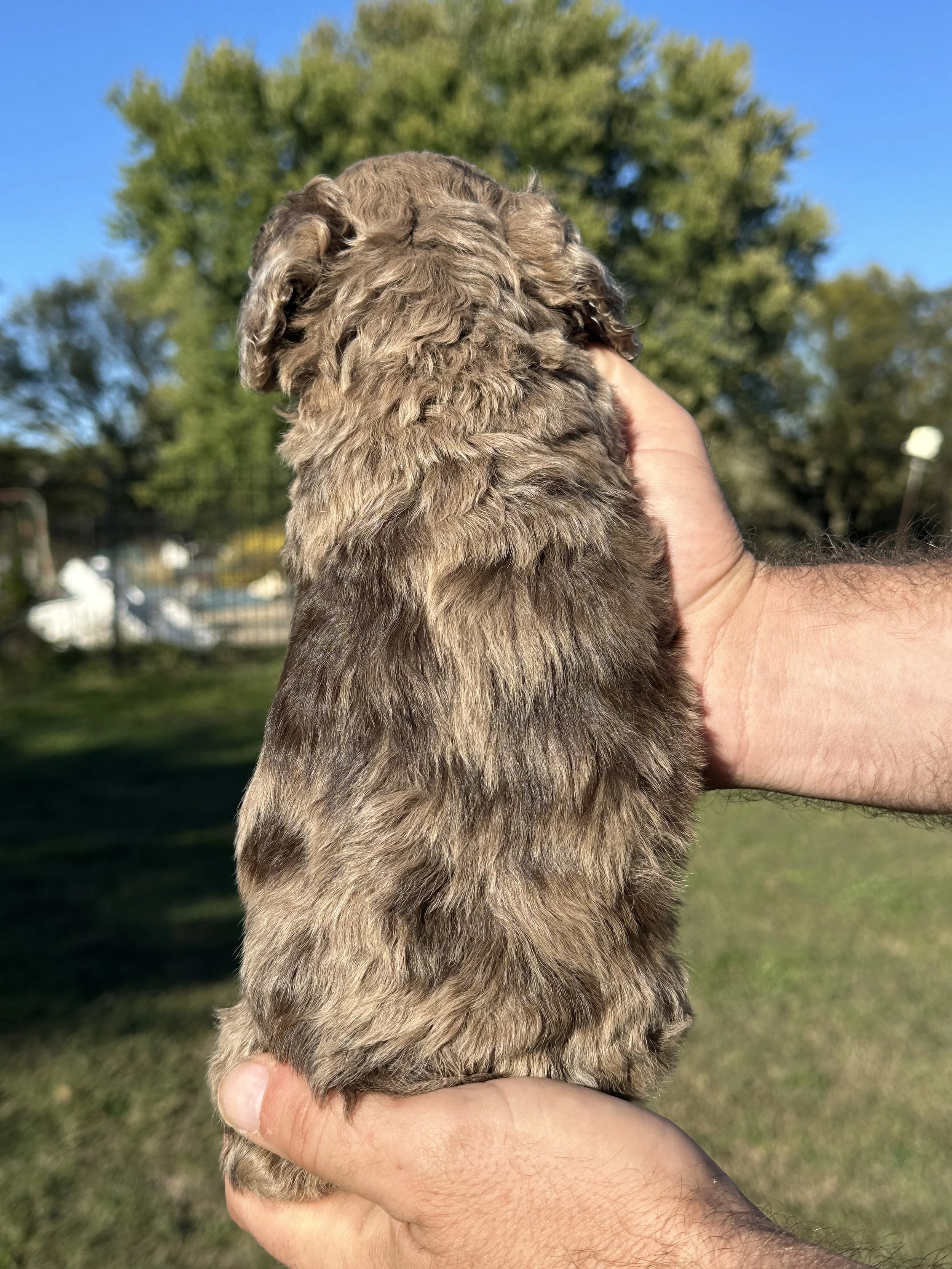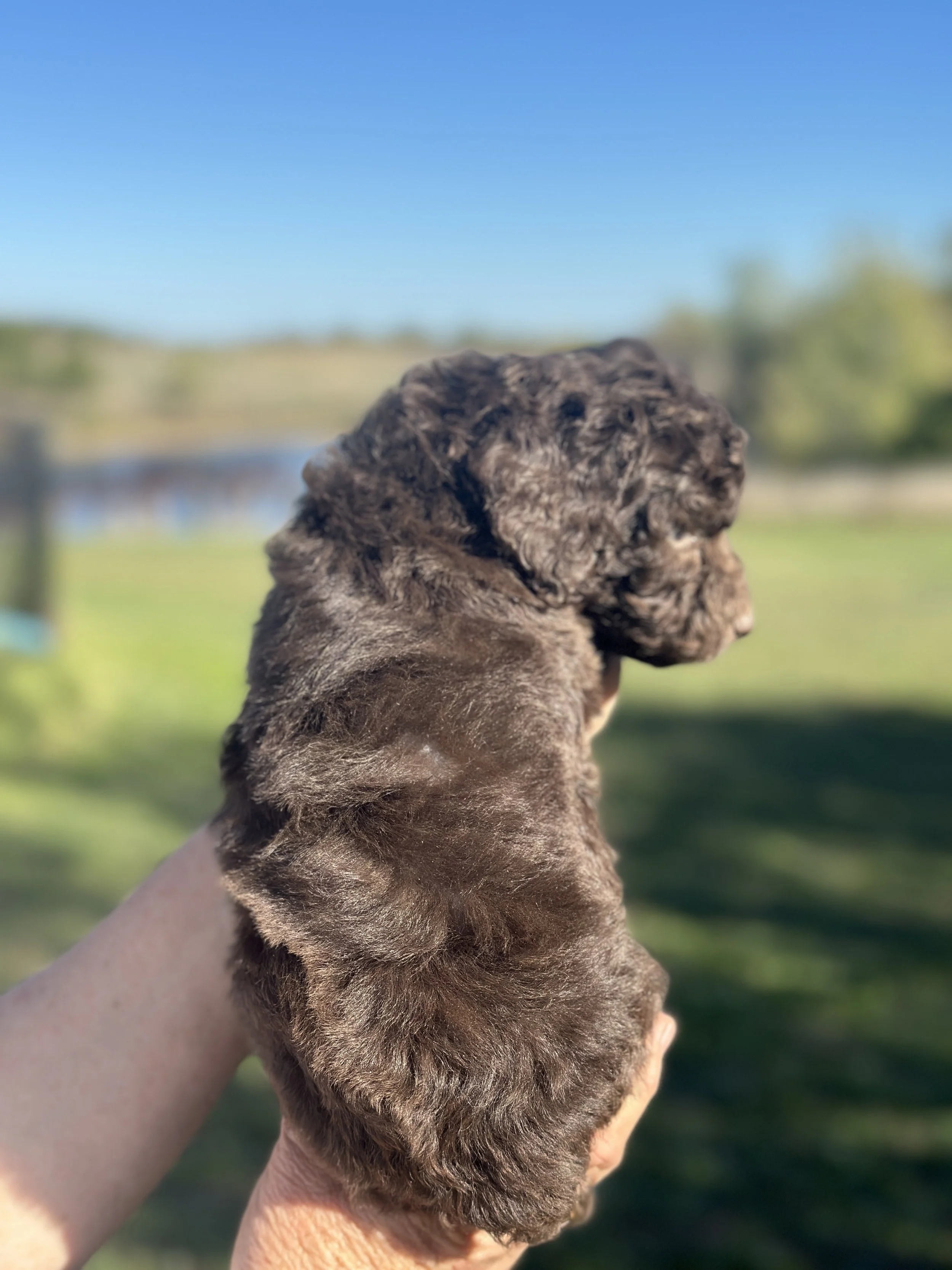 Another one of a kind puppy from Confetti, Cub sports a deep semisweet chocolate coat with lovely light green eyes. Even more unique - he has a natural bob-tail, completing his “teddy bear come to life” look.