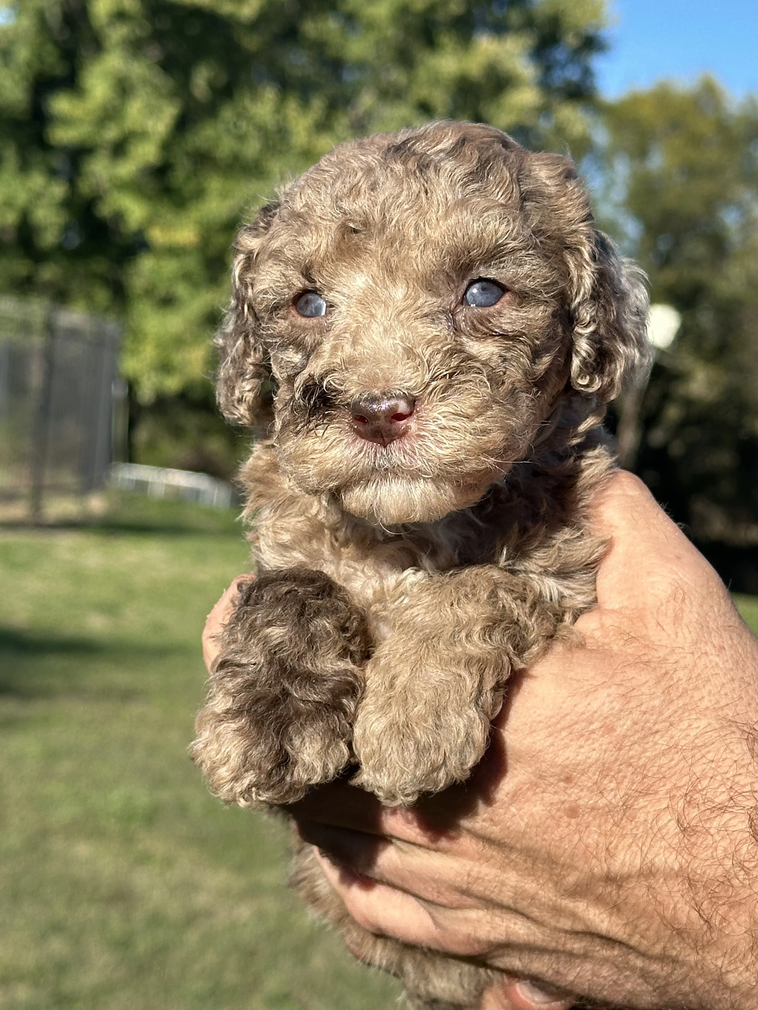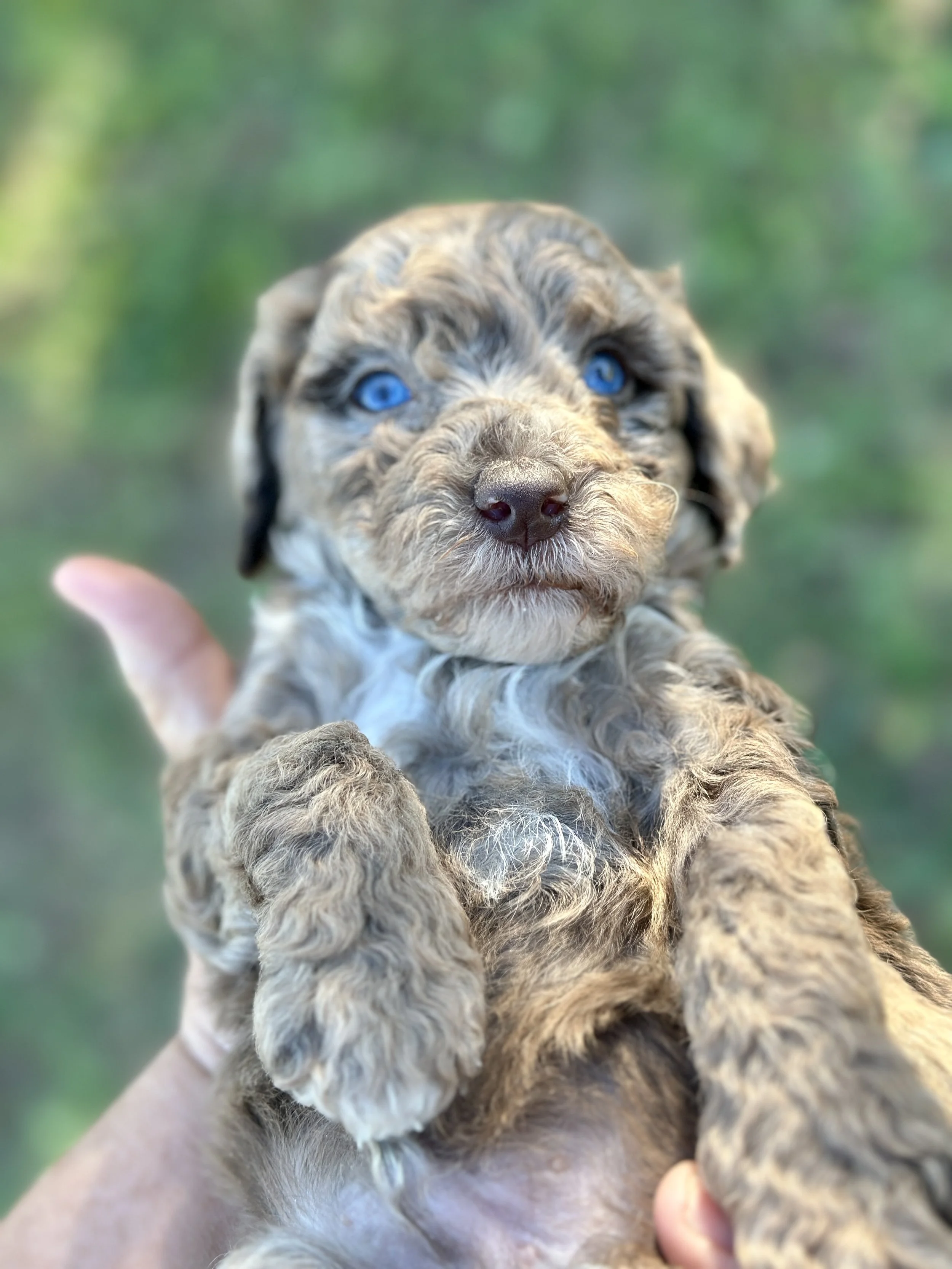 Confetti just cannot make a puppy that isn’t as unique as it is gorgeous. Here we have Chester, an incredible milk chocolate merle. Every merle puppy’s coat is as unique as a fingerprint or snowflake, and Chester pairs gorgeous, dramatic merle markings with seafoam green eyes.